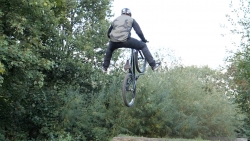 The No Foot is a jump on a mountain bike with both feet off the pedals. It might be a good idea to practice this trick on the flat first.