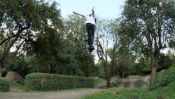 The Suicide No Hander is a no-handed jump in mountain biking. Both arms are stretched far back behind the body during the jump. The upper body has an upright posture. In this clip you can see the trick in super slow motion.